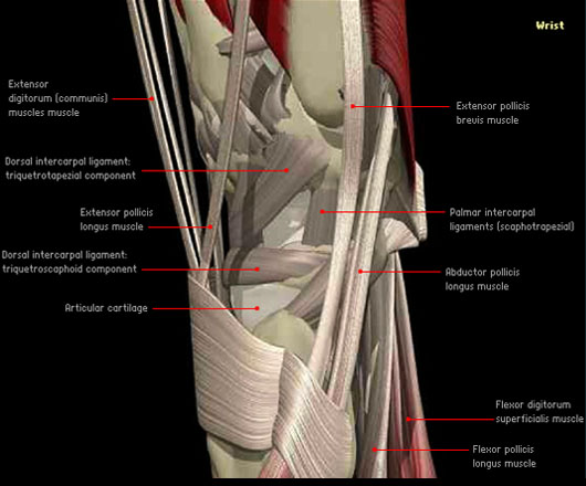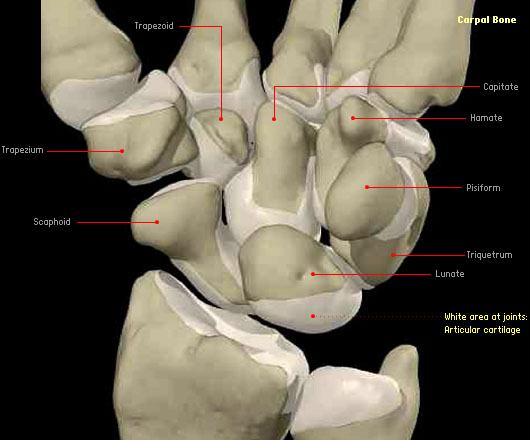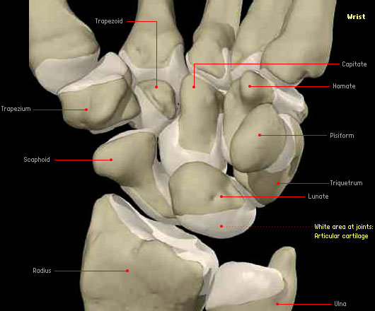 Articular cartilage, which covers the ends of the bones at each joint, is thinner in the wrist joint than in other large weight-bearing joints of the body - yet provides a smooth buoyant surface that allows the joint surfaces to glide across one another without causing damage. It's function is to serve as a type of shock absorber and facilitate movement. Articular cartilage in the wrist covers the sides of all of the carpal bones, as well as the ends of the bones connecting from the forearm to the fingers.