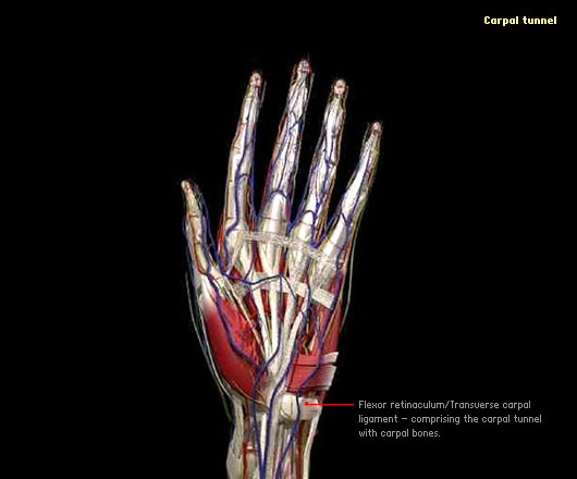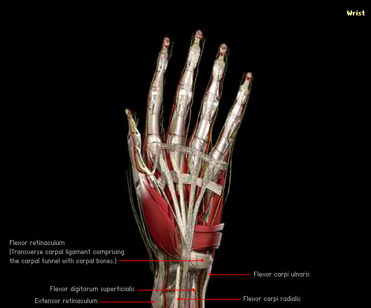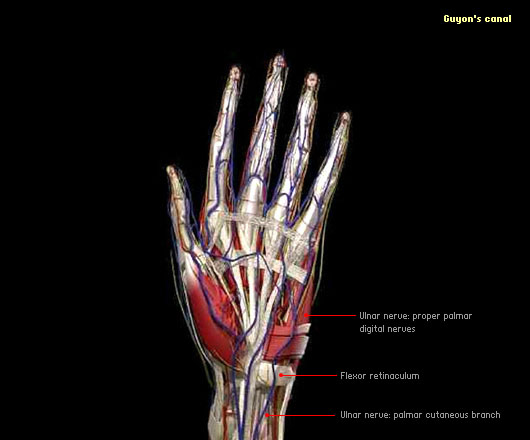 In the wrist, the median nerve and the tendons that flex the fingers to form a fist travel through the carpal tunnel compartment. The median nerve supplies sensation to the thumb, the first two fingers, part of the third finger, and some of the hand muscles. It also sends a nerve branch to control the thenar muscles of the thumb. The carpal tunnel is comprised of two walls - one of which is thick and consists of the carpal bones in the wrist and the other is shallow and consists of a thick ligament called the transverse carpal ligament located just under the skin at the palm side of the wrist. The ulnar nerve passes through the Guyon's canal, which is comprised of the two carpal bones the pisiform and the hamate.