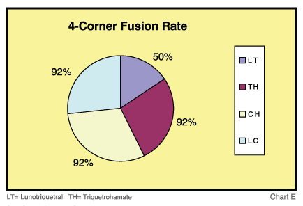 - The 4-corner fusions at an average radiographic follow-up of 5.2 months indicated radiographic fusion in 92% of the triquetrohamate joints, 92% of the capitohamate joints and 92% of the lunatocapitate joints - though only 50% of the lunotriquetral joints.