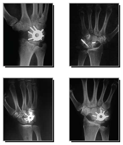 - The articular surface of the bones to be fused was denuded of articular cartilage. The joints were packed with bone graft obtained from the distal radius, or iliac crest. The plate was secured to each bone and followed by capsule and skin closure.