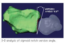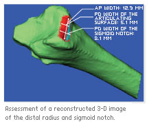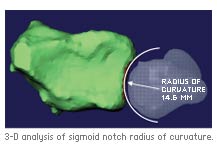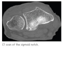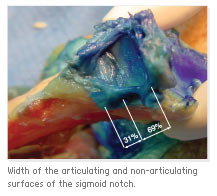 Fifteen freshly frozen, unpaired mid-brachium hand specimens were used. CT Scans were taken, followed by dissection and reconstruction of the distal radius. The sigmoid notch surface is divided into two surfaces - the articulating, an average of 79.78 mm2 (69.13%); and the non-articulating, an average of 35.84 mm2 (30.87%). The Anterior Posterior (AP) and Proximal Distal ((PD) widths of the articulating surface and the PD width of the sigmoid notch were reviewed, along with the radius of curvature, version angle and depth of the sigmoid notch.