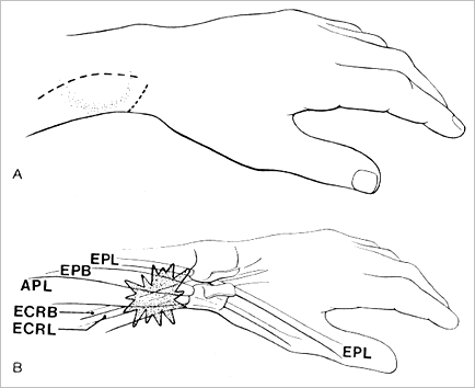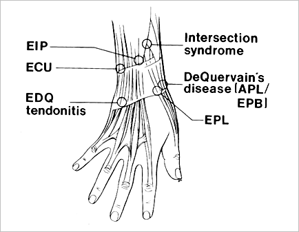 - Inflammation at the point of crossing of the "outriggers" (APL and EPB) with the radial wrist extensors (ECRL and ECRB)